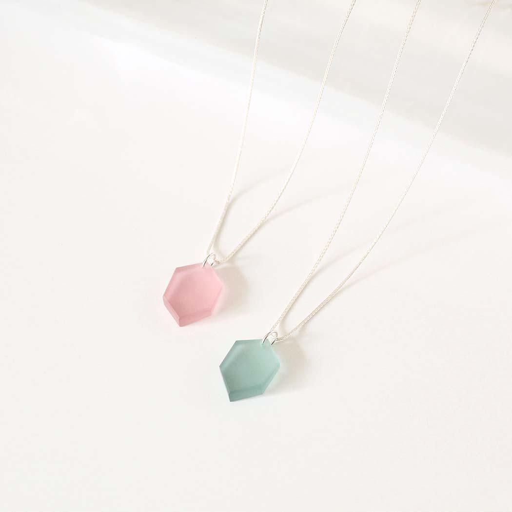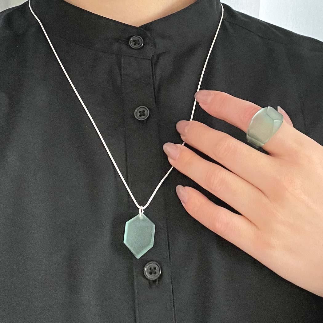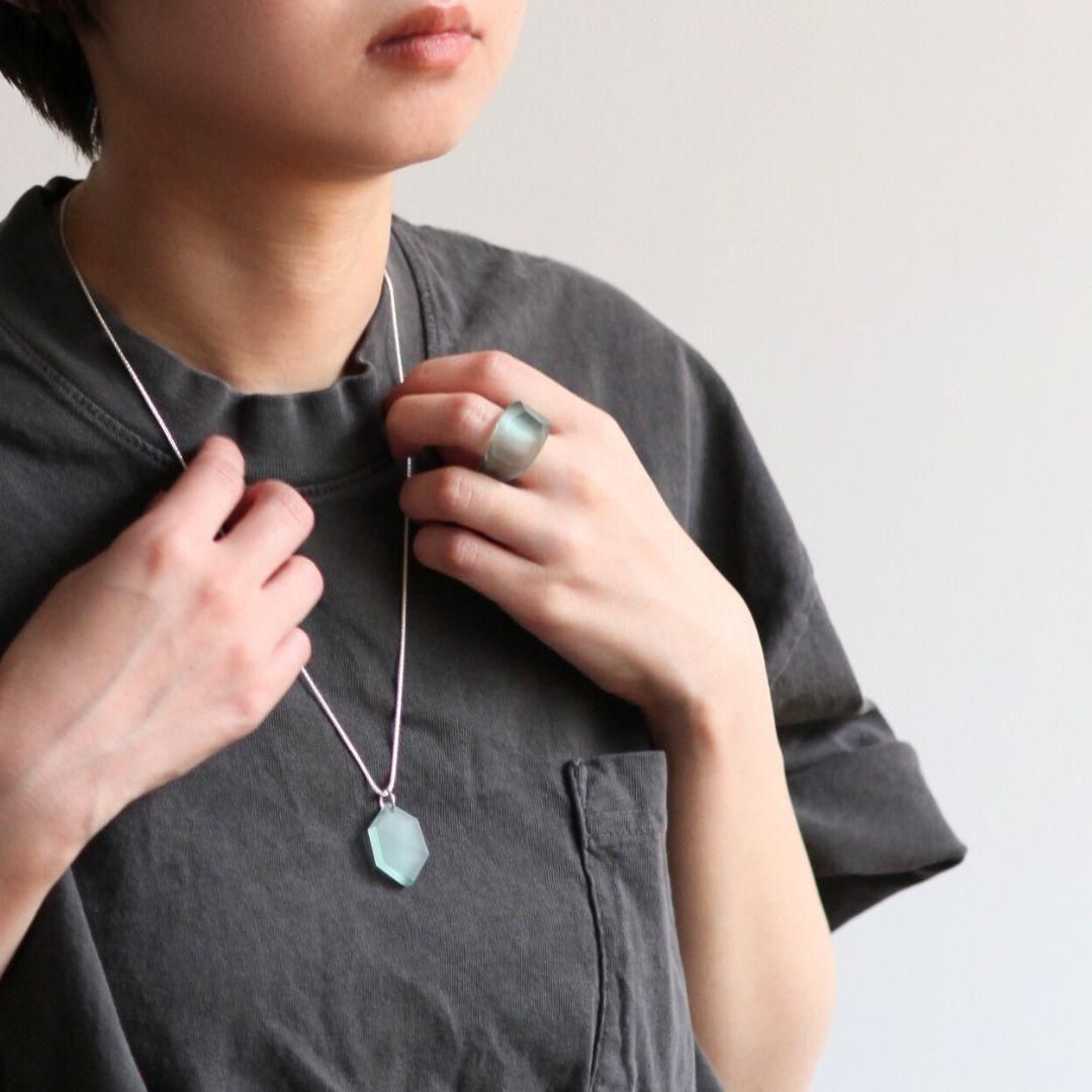 やや縦長で対称の六角形のモチーフは、マットな仕上げで上品に、内包する柔らかな光と線が胸元に静寂な景色をもたらします。