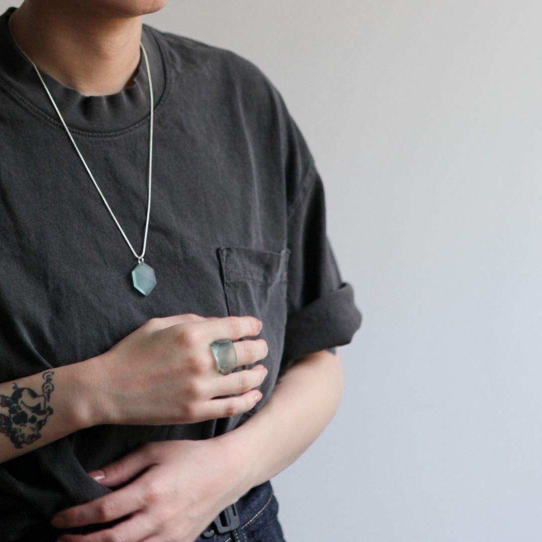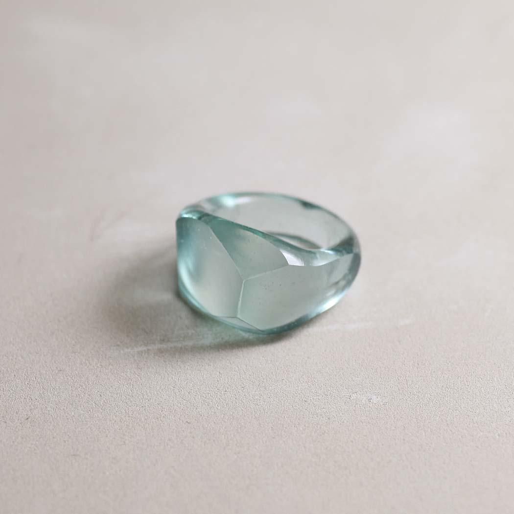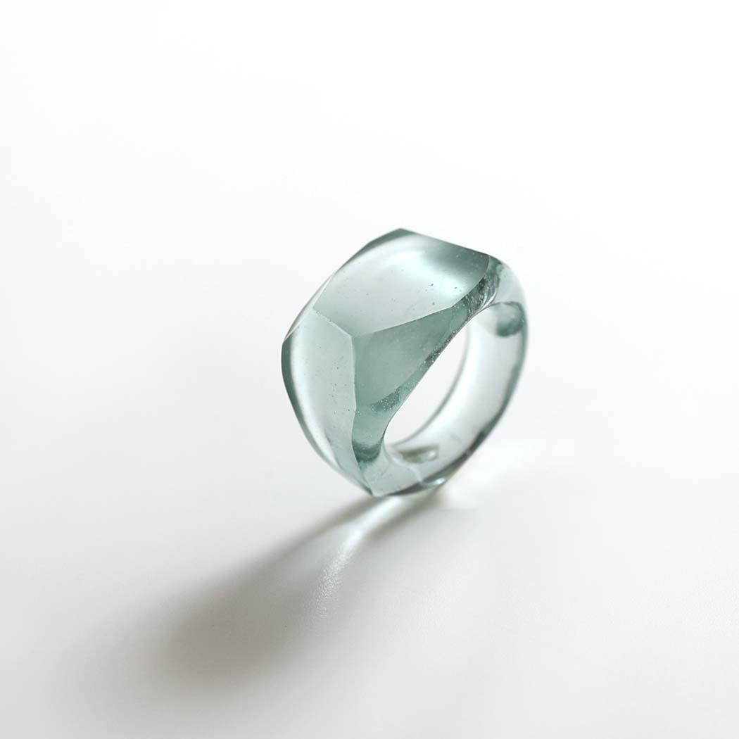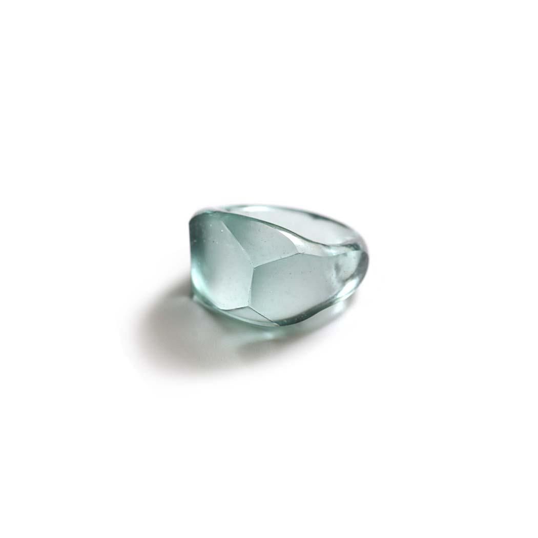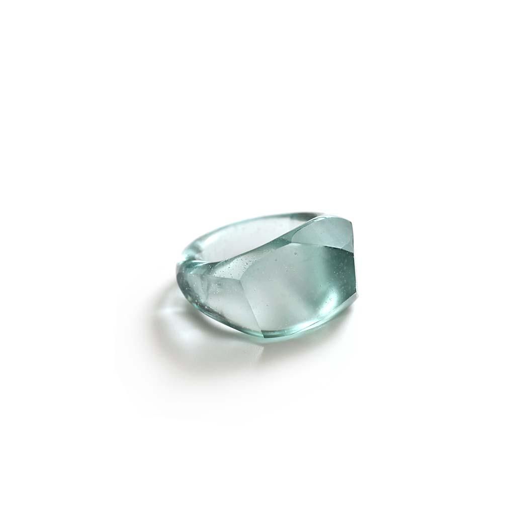 カットされた面のエッジを磨き、フォルムのアウトラインが際立つシャープなディテールと、指に触れる内側部分はガラスが溶けたままの滑らかさを残し、身につけた時の使用感を大切にしています。