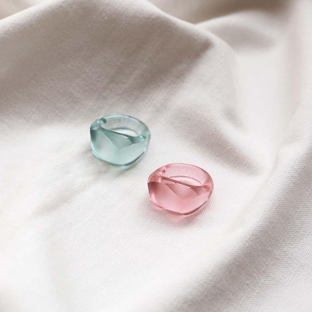 様々な形のカットを施したリングは、まるでガラスのリングがコロコロと転がって作られたような自然なフォルム。