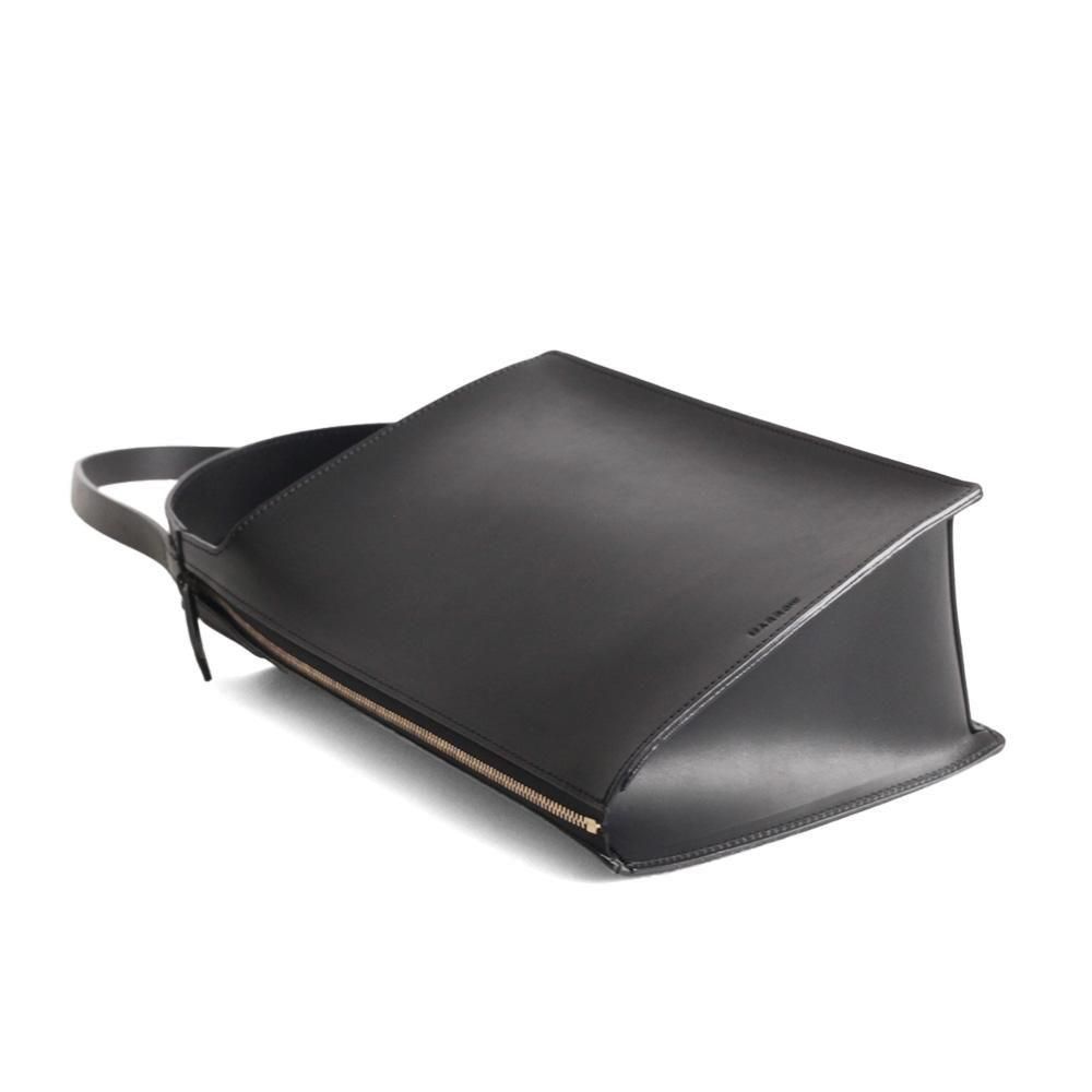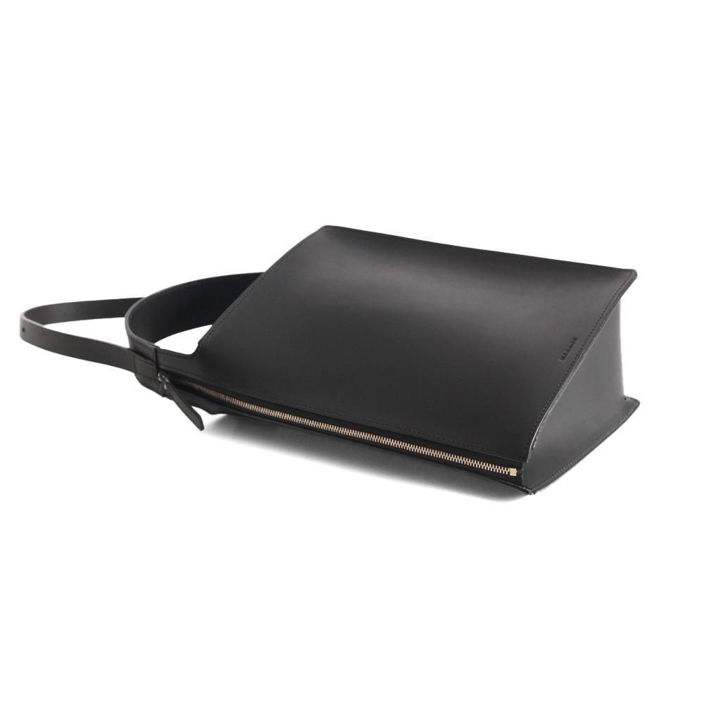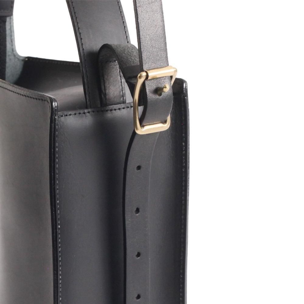 ヌメ革で構成された潔いフォルムは、持ち手を加えただけの極めてシンプルな構造。