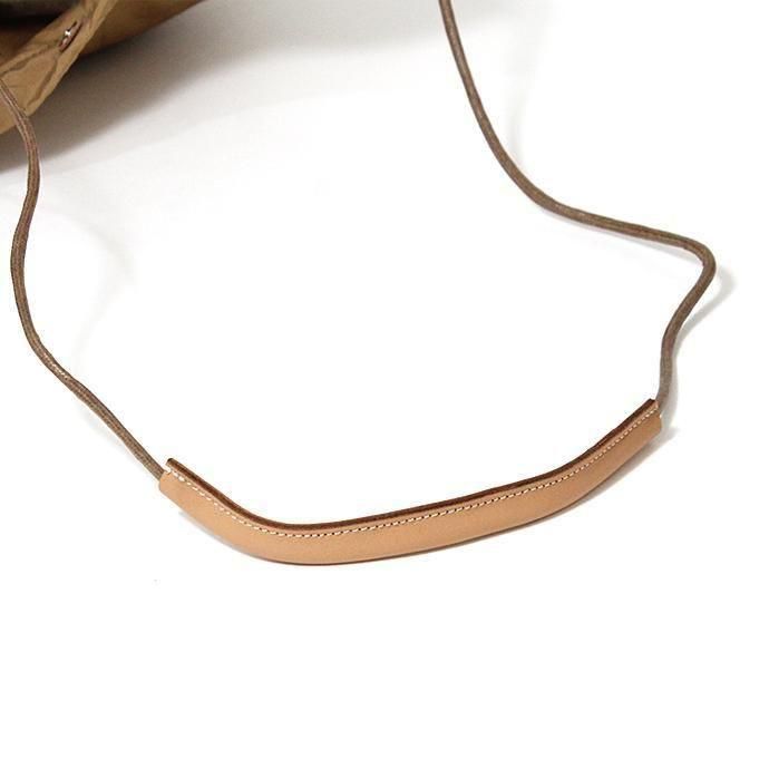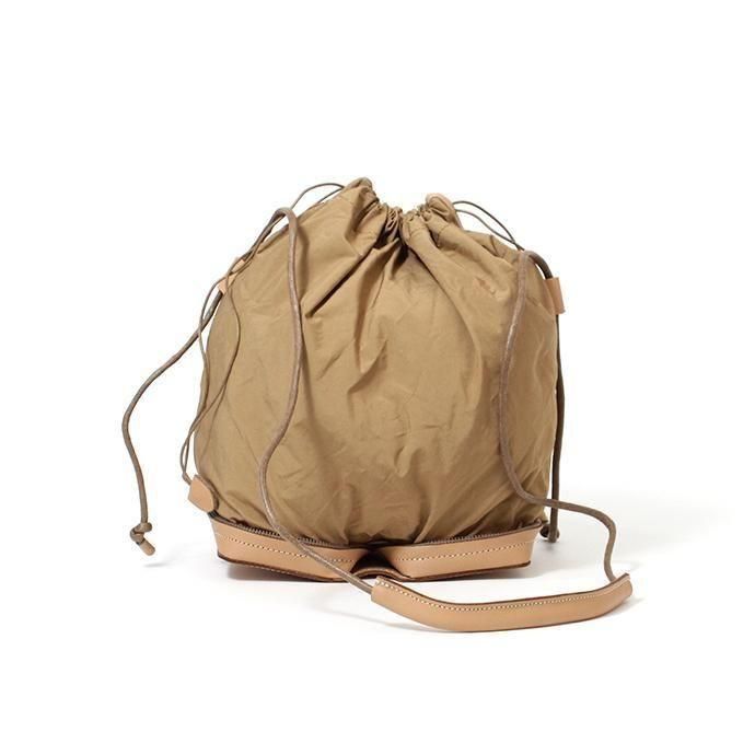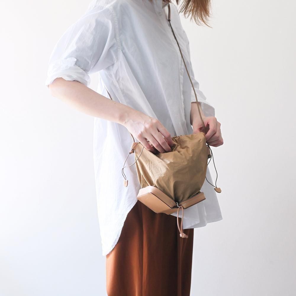 巾着型でショルダーストラップを好きな長さに結めば、長さの調節が可能です。