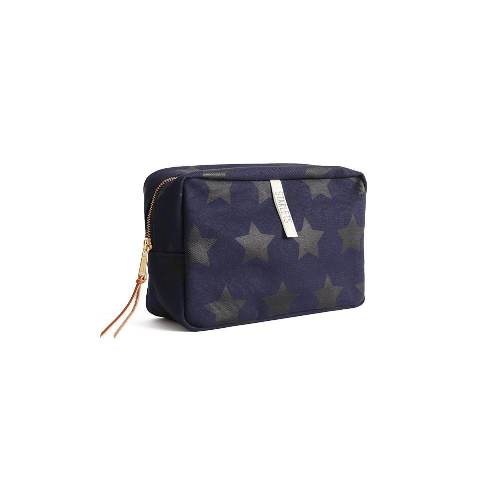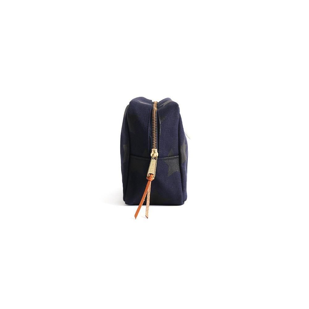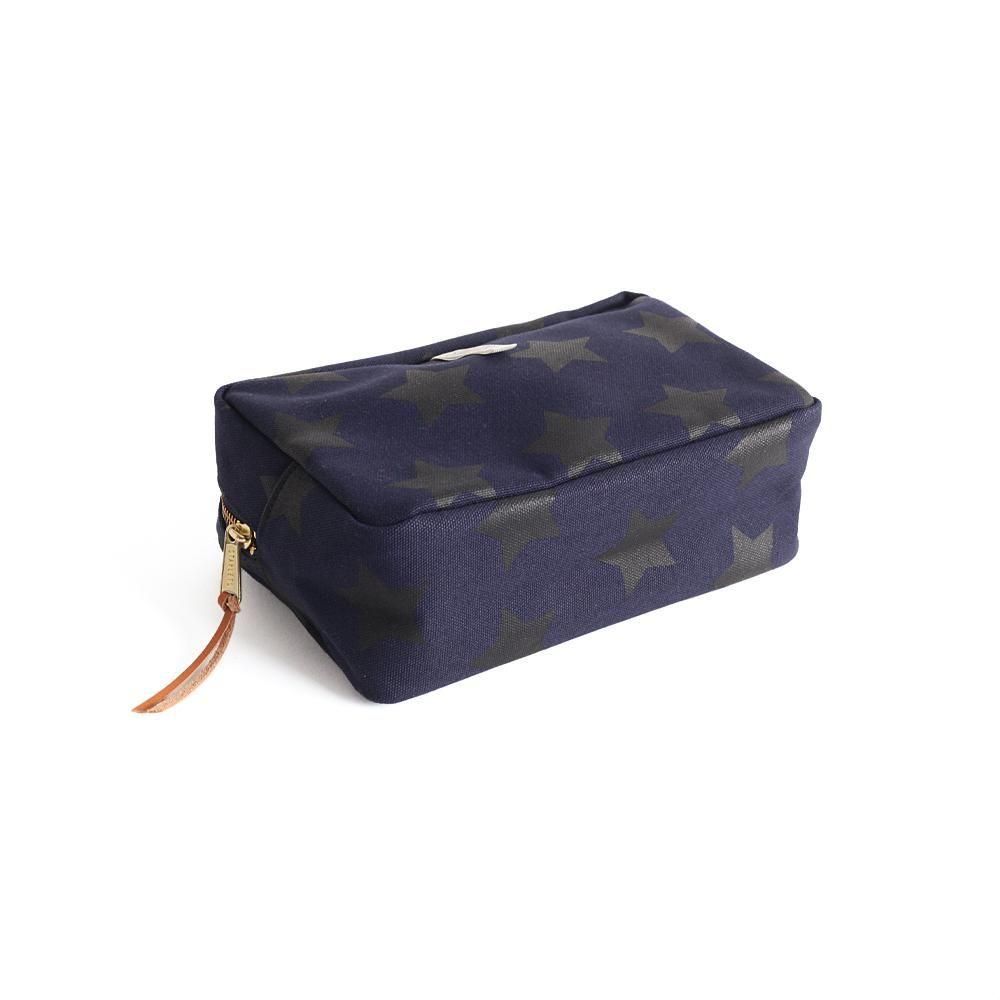 ネイビーのキャンバス地にブラックの星柄がプリントされた容量大きめのポーチです。