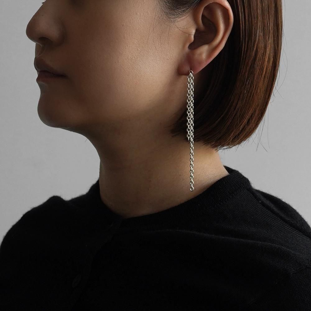 動きに合わせて揺れるチェーンが、耳元に軽やかなリズムを加え、日常のスタイルにも自然に馴染む、洗練されたジュエリーです。